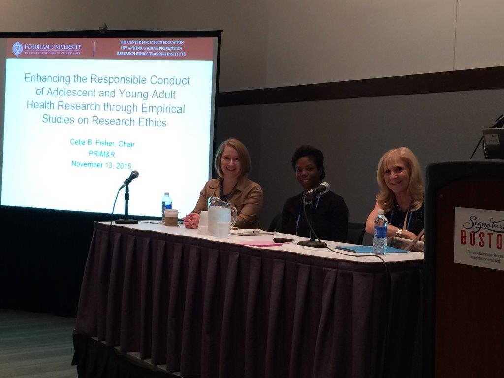 During this session, Bonar reviewed how mixed-method research (surveys and interviews) can illuminate best practices for assessing risks and benefits and protecting confidentiality in mobile health-based research on drug use and sexual risk among emerging adults. In addition, Fletcher described how empirical data on African American mothers’ and daughters’ attitudes toward adolescent participation in HIV biomedical prevention trials can inform IRB evaluations of research vulnerability. Finally, Fisher outline how to evaluate ethical justifications for requests to waive guardian permission using data from an innovative, web-based, asynchronous focus group methodology that examined ethical barriers and facilitators to lesbian, gay, bisexual and transgender (LGBT) youth participation in HIV prevention medication adherence trials.