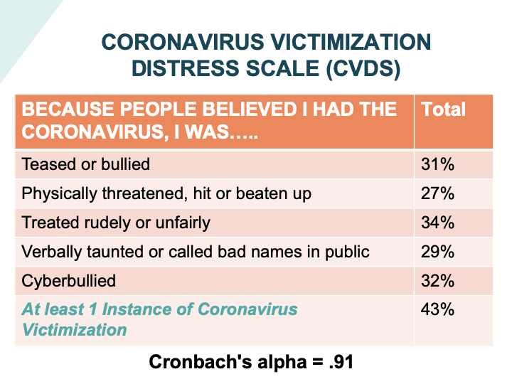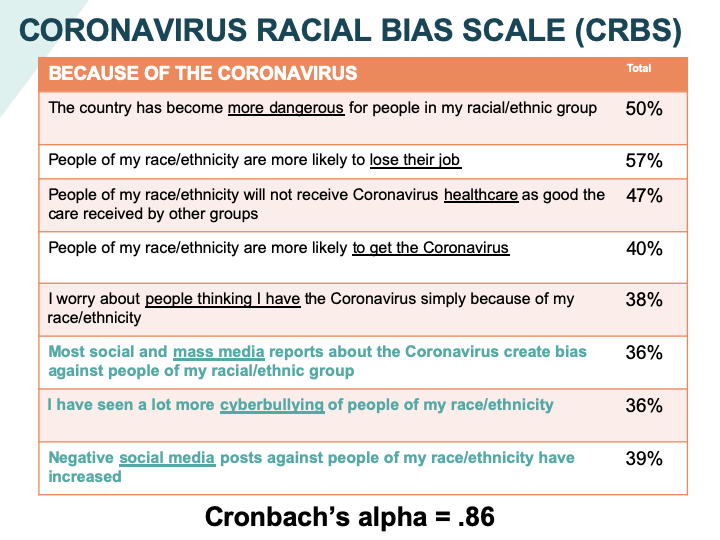 Additionally, the authors of the study developed two psychometrically validated scales: The Coronavirus (COVID-19) Racial Bias Scale (CRBS) and The Coronavirus (COVID-19) Victimization Distress Scale (CVDS).