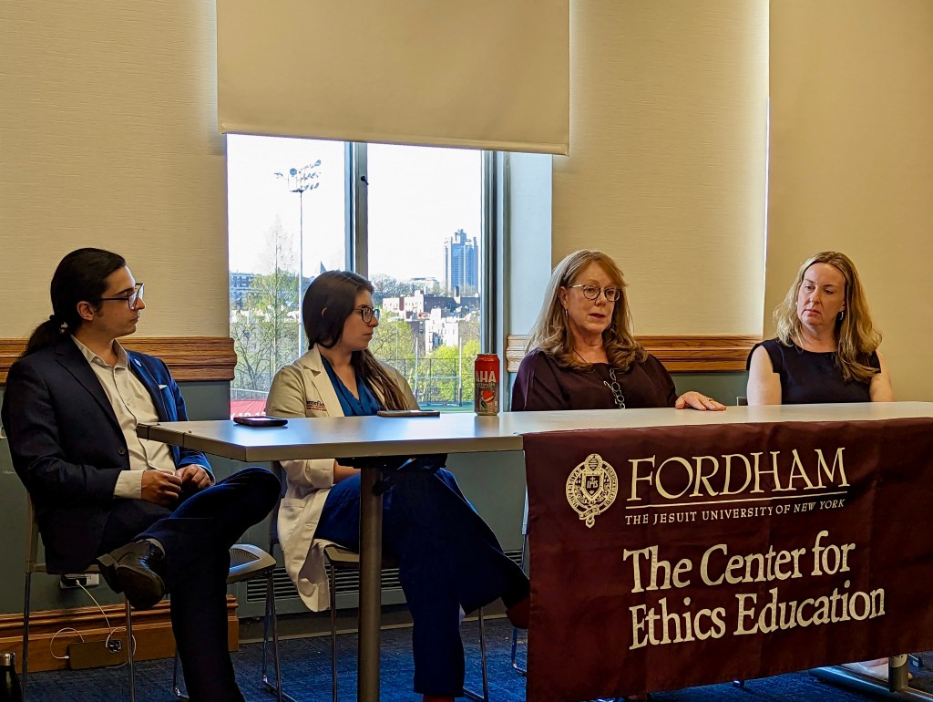 On Wednesday, April 12th, 2023, the Center for Ethics Education, jointly sponsored by GSAS Graduate Student Council, hosted the annual Careers in Ethics panel featuring alumni of the Master’s Degree Program in Ethics & Society, a 10-course interdisciplinary program that can be completed in one year on a full time basis, or two years if enrolled part time. The alumni panelists, Nicholas Garcia, JD, MA ’12, Maria Colucio, MD, MA ’16, Patricia Voorhees, MA ’13, Stefanie Juell, CIP, MA ’12, and moderator Steven Swartzer, PhD, Associate Director of Academic Programs and Strategic Initiatives, engaged in a discussion on how an ethics degree helped shape their careers since attending the program. Each panelist shared their experiences in integrating ethic into their respective fields, and how such decision making has impacted their development as real-world professionals, followed by a Q&A.